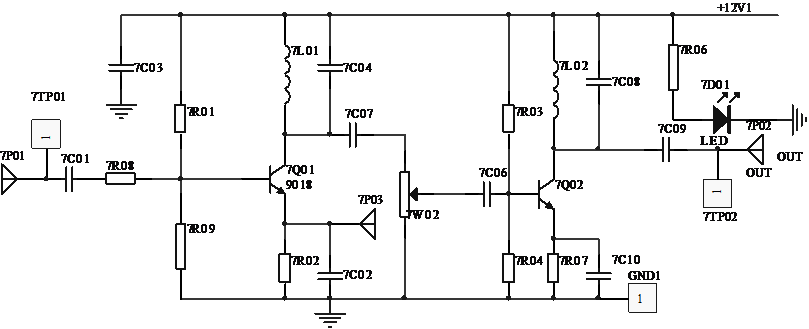从图可看出,本实验采用两级中频放大器,而且都是共发放大,这样可获得较大的增益。7W02用来调整中频放大输出幅度,7L01、7C04和7L02、7C08分别为第一级和第二级的谐振回路。7P01孔为自动增益控制(AGC)连接孔。