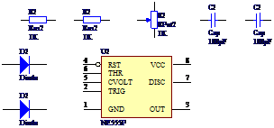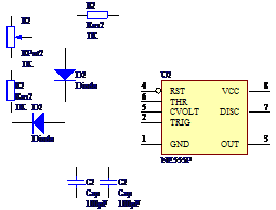 按钮,鼠标将变成十字形状,将电源、接地及网络标号移至合适位置,单击鼠标左键,即可完成绘制。按上面的方法连接元器件,连接后的效果如图2-12所示。